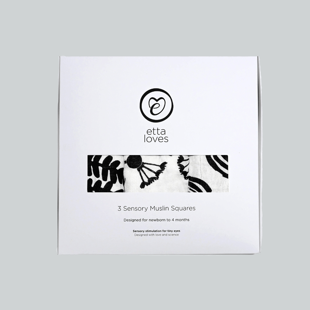 Az Etta Loves muszlin kendő szettje szuperpuha négyzetekből áll nagy kontrasztú fekete-fehér mintával. Milliméter pontossággal tervezve, hogy megfelelően támogassa a babák kognitív és vizuális fejlődését a születés és nagyjából négy hónapos kor között.