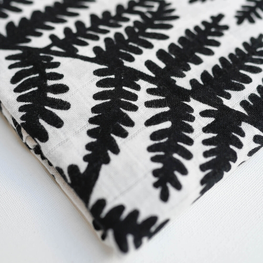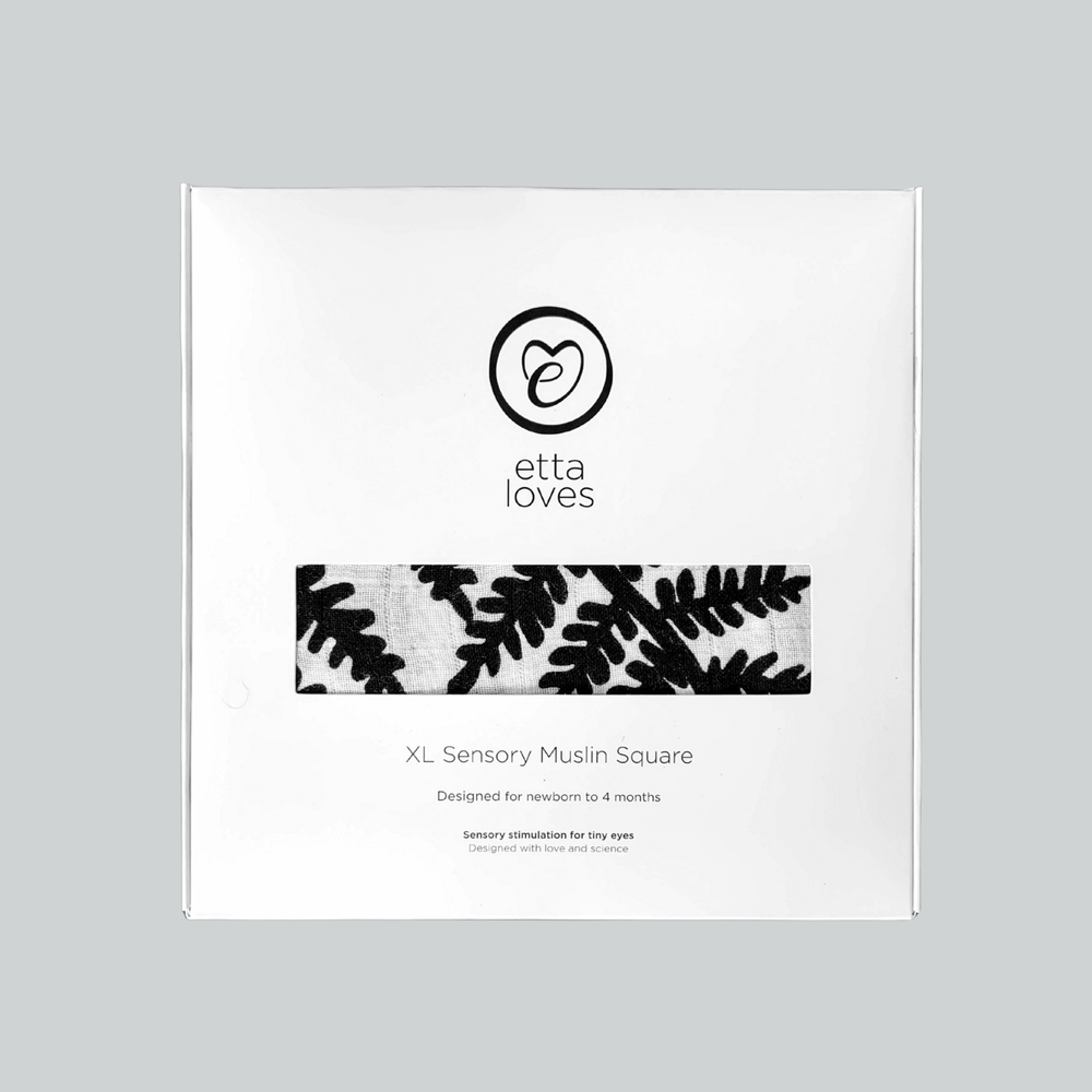 Az Etta Loves XL páfrány muszlin kendője szuperpuha négyzetből áll nagy kontrasztú fekete-fehér mintával. Milliméter pontossággal tervezve, hogy megfelelően támogassa a babák kognitív és vizuális fejlődését a születés és nagyjából négy hónapos kor között.